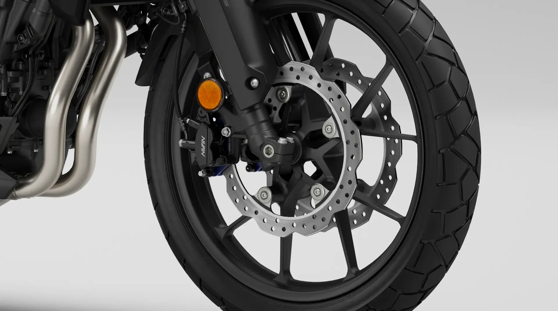 La nueva NX 500 incorpora doble disco delantero de 296mm de diámetro, con pinzas Nissin de 2 pistones. El disco trasero, de 240mm de diámetro, también es accionado por una pinza Nissin de pistón simple. Y el ABS de doble canal garantiza la máxima eficiencia y seguridad en el frenado.