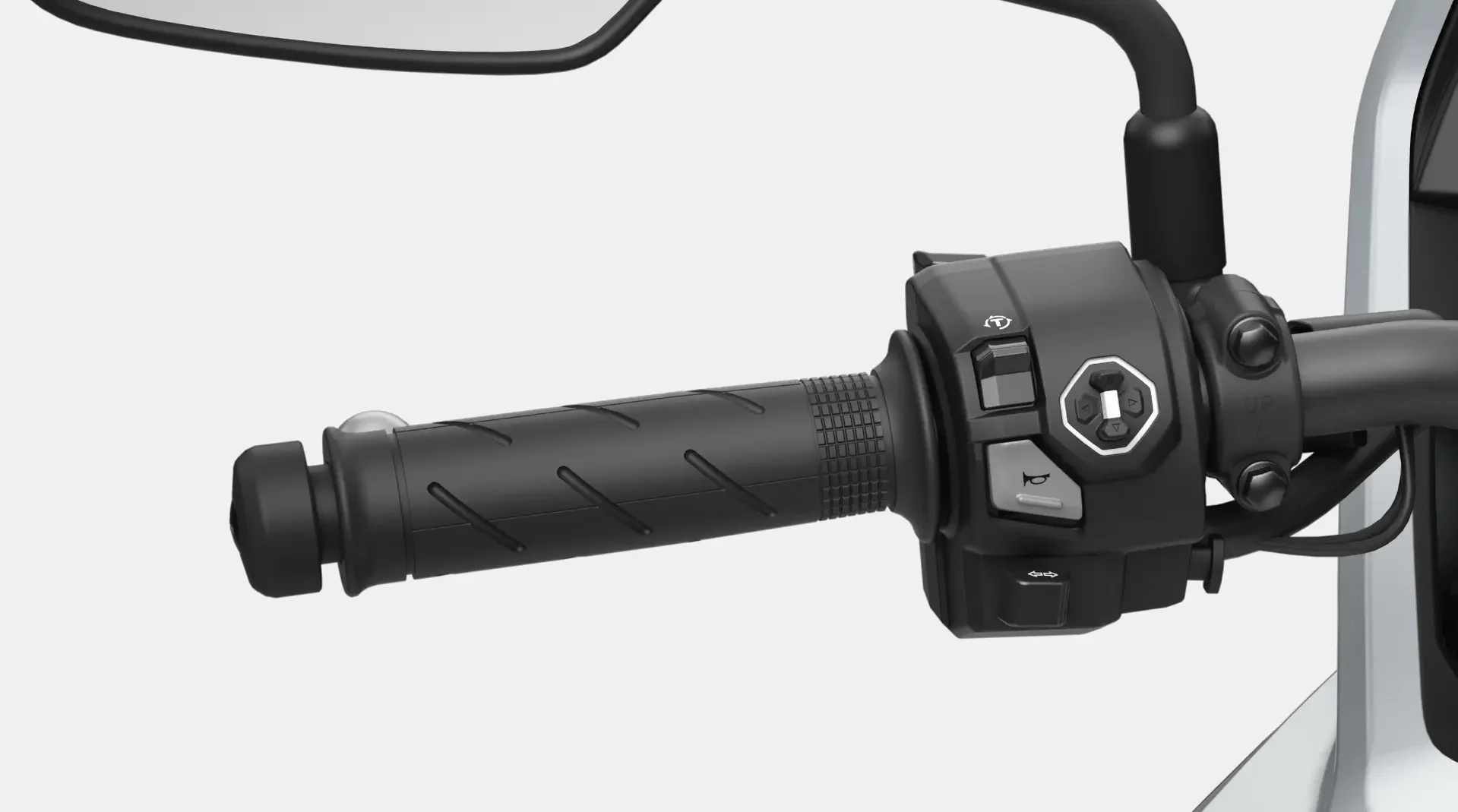 Del lado izquierdo del manillar, el switch multifuncional puede accionarse en 4 direcciones para ajustar múltiples configuraciones en el tablero TFT, como por ejemplo los estilos de display (BAR, CIRCLE, SIMPLE) o el color de fondo (WHITE, BLACK, AUTO). Además, está iluminado por LED, lo que lo vuelve fácil de ubicar y accionar, además de aportar sofisticación al conjunto.